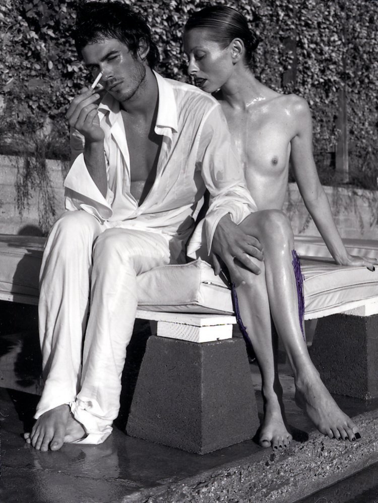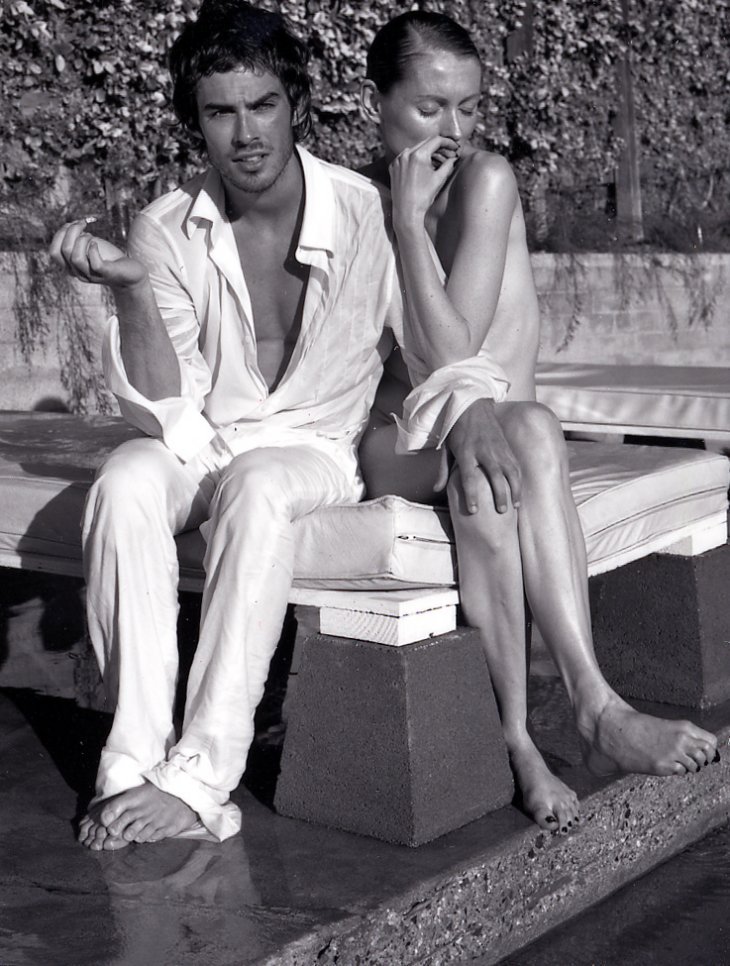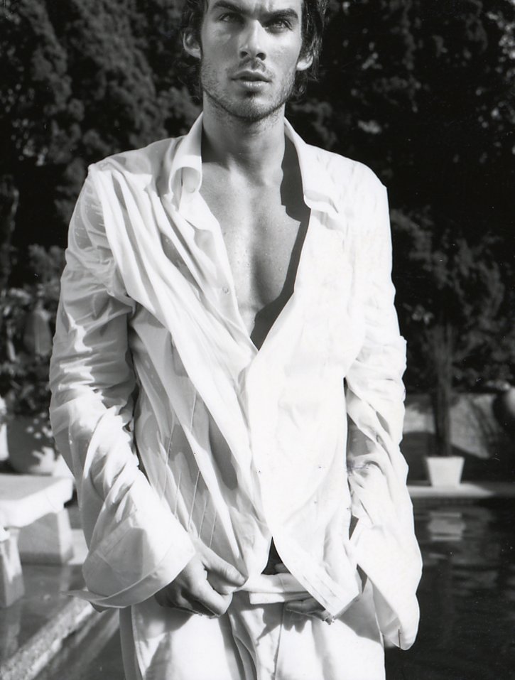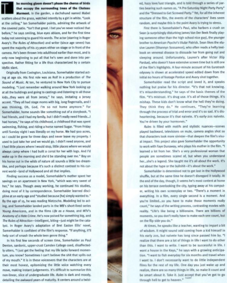 Утренний сумрак заполняет хор птиц, которые сидя на окружающих замок Мармонт деревьях. В саду девушка в белом наблюдает за играющей на траве таксой по кличке Мейбел. "Взгляни на потолок, - указывает Ян Сомерхолдер, восхищаясь художественным убранством крытого внутреннего дворика. - Разве не великолепно? Держу пари, что раньше ты этого не замечала!" - говорит он, улыбаясь и сверкая голубыми глазами, и впервые за сегодня не кажется хранителем своих слов. Актер (снялся в фильме Роджера Эйвори "Правила секса") и сценарист (с 7-летнего возраста) провел большую часть своих 23 лет на подиуме или перед камерой. Во взрослую жизнь он пришел гораздо раньше, чем многие другие, и только сейчас начал понимать, что же он видел и сделал в перспективе. Скорее для соответствия жизни, он делает некий идеалистический уклон.Родившись в Ковингтоне, штат Луизиана, Сомерхолдер стал играть в 6-летнем возрасте. Его первой ролью был Рольф в постановке "Звуки музыки". В 10 лет он решился переехать в Нью-Йорк, чтобы заняться моделированием. "Я помню, как ходил по Нью-Йорку смотрел на здания, ходил на кастинги и прослушивания со всеми этими детьми... они все были из Джерси, - говорит он, имитируя акцент жителей Нью-Джерси. - Они все были с мамами, у которых были длинные ногти, и я думал 'О Боже, я теперь я не дома'". Для Сомерхолдера дом стал похож на нечто из сказок. "У меня были друзья, у меня семья, но в действительности я не нуждался в друзьях... У меня были лошади", - говорит он о своем детстве, которое он провел, плавая, рыбача и катаясь на лошади по кличке Шугар. "С пятницы по воскресенье я буквально всё время проводил на своей лошади. У нас было 900 акров , поэтому я никогда не выезжал с нашей территории. Я просто садился на неё и ехал. Мне никто не был нужен, у меня были места, где я останавливался, местечки, где мы останавливались лагерем, где я построил для неё загон из досок. Я просыпался утром, а она стояла около меня". Мальчик на лошади посреди дикой природы - похоже на мечту, возможно потому, что теперь это выделяется контрастом в его сегодняшнем мире - Голливуде.