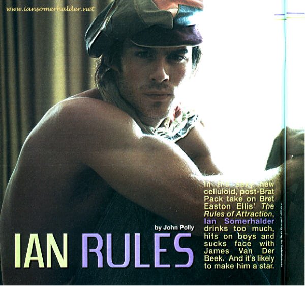 В новом сексуальном фильме новоиспеченные звезды играют по "Правилам секса" Брета Истона Эллиса, Ян Сомерхолдер много пьет, пристает к парням и лобызает лицо Джеймса Ван Дер Бика. Вероятно, это сделает его звездой, ведь это Голливуд.Ян Сомерхолдер - бесспорно один из самых великолепных и напористых молодых актеров, работающих сегодня, он разговаривает со мной по сотовому телефону, в то время как ведет машину по бульвару Сансет в Лос-Анджелесе, направляясь на студию. Вы можете представить пальмы, пролетающие мимо, дневное марево, ветер, который взъерошивает ему волосы, солнечные лучи, играющие на его коже, его улыбку...