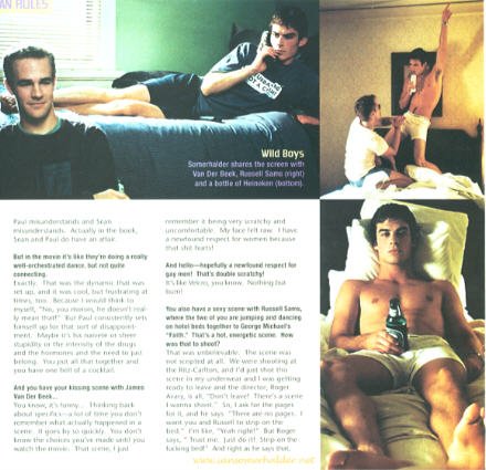 Но сам Сомерхолдер не такой простой парень. Он натурал, бывшая модель, а сейчас разрывается между Нью-Йорком и Лос-Анджелесом, пытаясь сыграть все цвета сексуального спектра. Он сыграл одного из гомофобных убийц Мэтью Шепарда в "Анатомии преступления" на канале MTV; гада, который был сутенером у Хайдена Кристенсена в "Жизни, как дом", а также сексуально запутавшегося парня, который влюбился в переодетую парнем девушку в "Молодых американцах". И он не боится говорить обо всех этом искренне, нам же он рассказал о поцелуе с Джеймсом Ван Дер Биком, съемках с Фей Дановей (которая сыграла его мать в "Правилах...") и раздевании на экране.