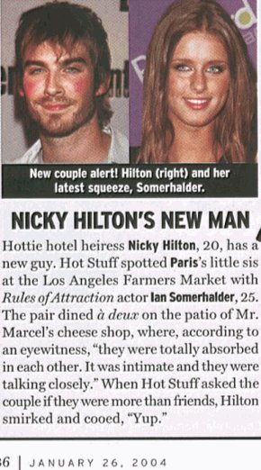 Тревога: новая парочка! Хилон (справа) и её друг, Сомерхолдер.У богатой наследницы сети отелей 20-летней Никки Хилтон появился новый парень. Внимательные прохожие заметили младшую сестричку Пэрис в лос-анджелесском Фармерс-Маркете с актером из "Правил секса", 25-летним Яном Сомерхолдером. Пара обедала на открытом внутреннем дворике сырного магазина мистера Марсела, где по свидетельствам очевидцев "Они были полностью поглощены друг другом". Когда их спросили о том, что они больше чем друзья, Хилтон ухмыляясь, проворковала "Ага".