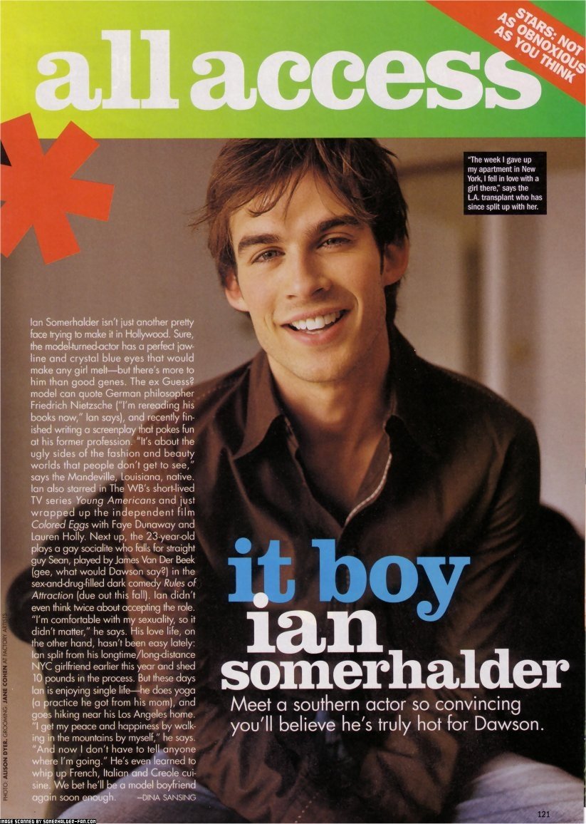 Ян Сомерхолдер не просто еще одно симпатичное лицо, которое пытается пробиться в Голливуд. Несомненно, "модель, перешедшая в разряд актеров" имеет прекрасную линию челюсти и кристально синие глаза, которые заставят растаять любую девушку - но есть нечто большее в нем, чем просто хорошие гены. Бывшая модель "Guess?" может цитировать немецкого философа Фридриха Ницше ("Сейчас я перечитываю его книги", - говорит Ян), а недавно он закончил написание сценария, который рассказывает о его прежней профессии. "Это об уродливых сторонах моды и мира красоты, которые люди не должны видеть" - говорит уроженец Мандевилл, штат Луизиана. Ян снялся в сериале "Молодые американцы", и только что закончил работу над фильмом "Colored Eggs" с Фэй Данновэй и Лорен Холли. Затем в 23 года он сыграл гея, который влюбился в гетеросексуала Шона, которого сыграл Джеймс Ван Дер Бик (Ну и дела, чтобы сказал Доусон???) в черной комедии о сексе и наркотиков "Правила секса". Ян не думал дважды, прежде чем согласиться на эту роль. "Я доволен своей сексуальностью, поэтому это не имеет значение", - говорит он. Он любит жизнь, но с другой стороны, она не была для него легка в последние время: Ян разошелся с девушкой в начале года, не смотря на то, что они долго встречались, их разъединяло большое расстояние до Нью-Йорка, из-за разрыва он сбросил 4 килограмма. В эти дня Ян наслаждается холостятской жизнью - занимается йогой, которой его научила мама, прогуливается по окрестностям Лос-Анджелеса. "Я наслаждаюсь миром и счастьем, когда гуляю по холмам один, - говорит он. - Теперь мне не надо никому говорить, куда я иду". Он изучил французскую, итальянскую и креольскую кухню. Держу пари, что скоро он снова станет образцовым парнем.