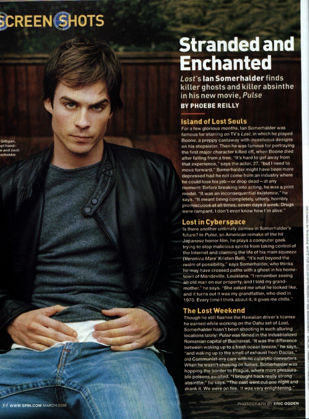 Остров потерянных душВ течение нескольких великолепных месяцев, Ян Сомерхолдер был известен тем, что снимался в телевизионном сериале "Остаться в живых", где играл Буна, выпускника частной средней школы, потерпевшего авиакатастрофу и имеющего кровосмесительную связь со своей сводной сестрой. Потом он стал известен тем, что стал первым убитым главным персонажем, когда Бун умер после падения с дерева. "Это был трудный жизненный опыт, - говорит 27-летний актер. - Но я должен двигаться дальше". Сомерхолдер мог быть более удрученным, если бы не пришел из индустрии, где он мог потерять работу в любой момент: перед тем, как стать актером, он был фотомоделью. "Это было незначительно существование, - говорит он. - Это означает быть полностью, весьма, ужасно разношерстным, все семь дней в неделю. Безумный наркотики. Я даже не знаю, как выжил".