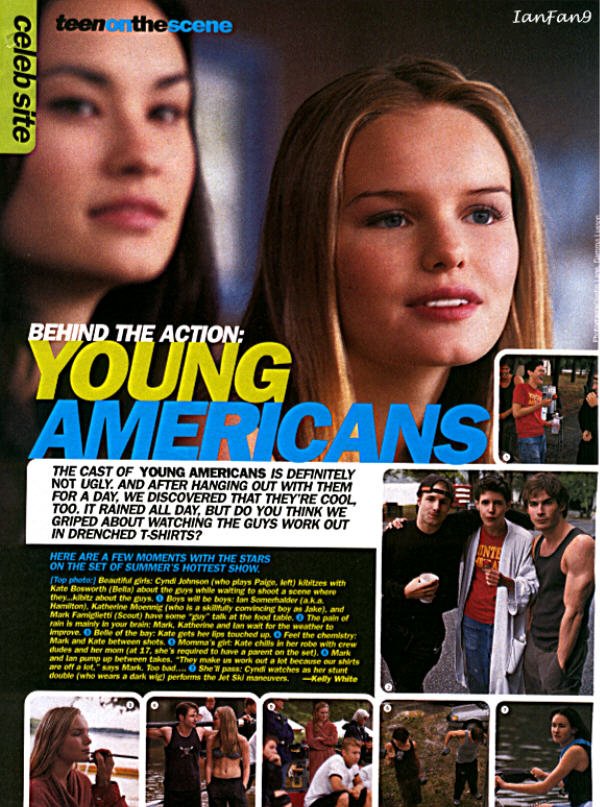 Верхнее фото: очаровательные девушки - Синди Джонсон (которая играет Пейдж, слева) дает советы о парнях Кейт Боусворт (Белла), пока они ждут съемок сцены, где они... советуются о парнях.1: Парни всегда останутся парнями - Ян Сомерхолдер (известный так же, как Хамильтон), Кэтрин Моеннинг (которая убедительно воплотила образ парня по имени Джейк) и Марк Фамиглитти (Скотт) ведут мальчишеский разговор около обеденного стола.