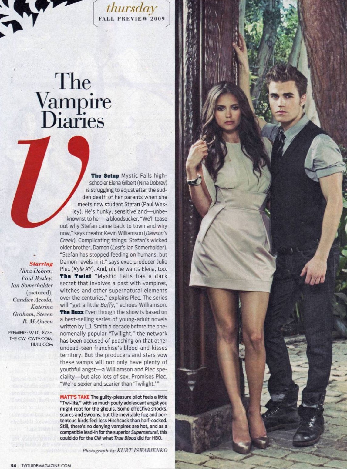 Старшеклассница Мистик-Фоллс Елена Гилберт (Нина Добрев) изо всех сил пытается прийти в себя после внезапной смерти своих родителей, когда она встречает нового школьника Стефана (Пол Уэсли). Он – привлекательный, чуткий кровопийца, о чем она не знает. «В будущем мы узнаем, почему Стефан вернулся в город и почему именно сейчас», - рассказывает создатель Кэвин Уильямсон («Бухта Доусона»). Но есть осложнение – злой старший брат Стефана, Дэймон (Ян Сомерхолдер из «Остаться в живых»). «Стефан перестал питаться людьми, но Дэймон упивается этим», - рассказывает исполнительный продюсер Джулии Плек («Кайл XY») И да, он тоже хочет Елену. Изюминка в том, что «В Мистик-Фоллс имеется темный секрет, который связан с прошлым и вампирами, ведьмами и другими сверхъестественными явления сквозь столетия», - объясняет Плек. В сериале будет «немного от “Бафии”», - вторит Уильямсон. Повышенное внимание к сериалу связано с тем, что, не смотря на то, что шоу основано на пользующихся спросом романах для подростков, написанных Л.Дж. Смит за десять лет до феноменально популярных «Сумерек», студия была обвинена во вторжении на территорию любовно-кровавых историй о вампирах. Но продюсеры и актеры клянутся, что у их вампиров будут не только подростковые переживания, но и большое количество секса. Плек обещает: «Мы будет более сексуальные и пугающие, чем “Сумерки”».Пилотная серия этого запретного удовольствия выглядит немного похожим на «Сумерки» с большим количеством подростковых переживаний, что вы можете пожалеть вампиров. Эффектные шоки, паники и обмороки, но неотвратимый туман и зловещие птицы – выглядят недоделанным Хичкоком. Но без сомнения, вампиры – сексуальны и вполне могут демонстрироваться перед бесподобным сериалом «Сверхъестественное», они могут сделать для канала CW то же самое, что сделала «Настоящая кровь» для канала HBO.