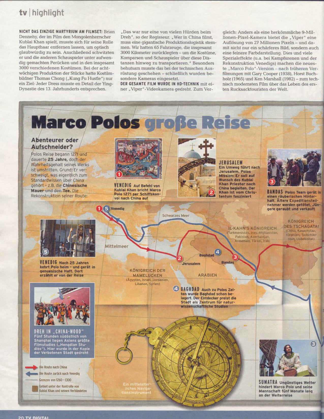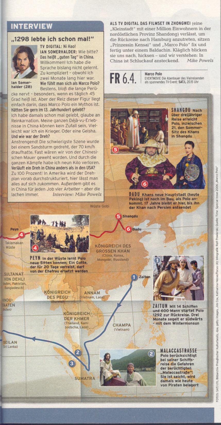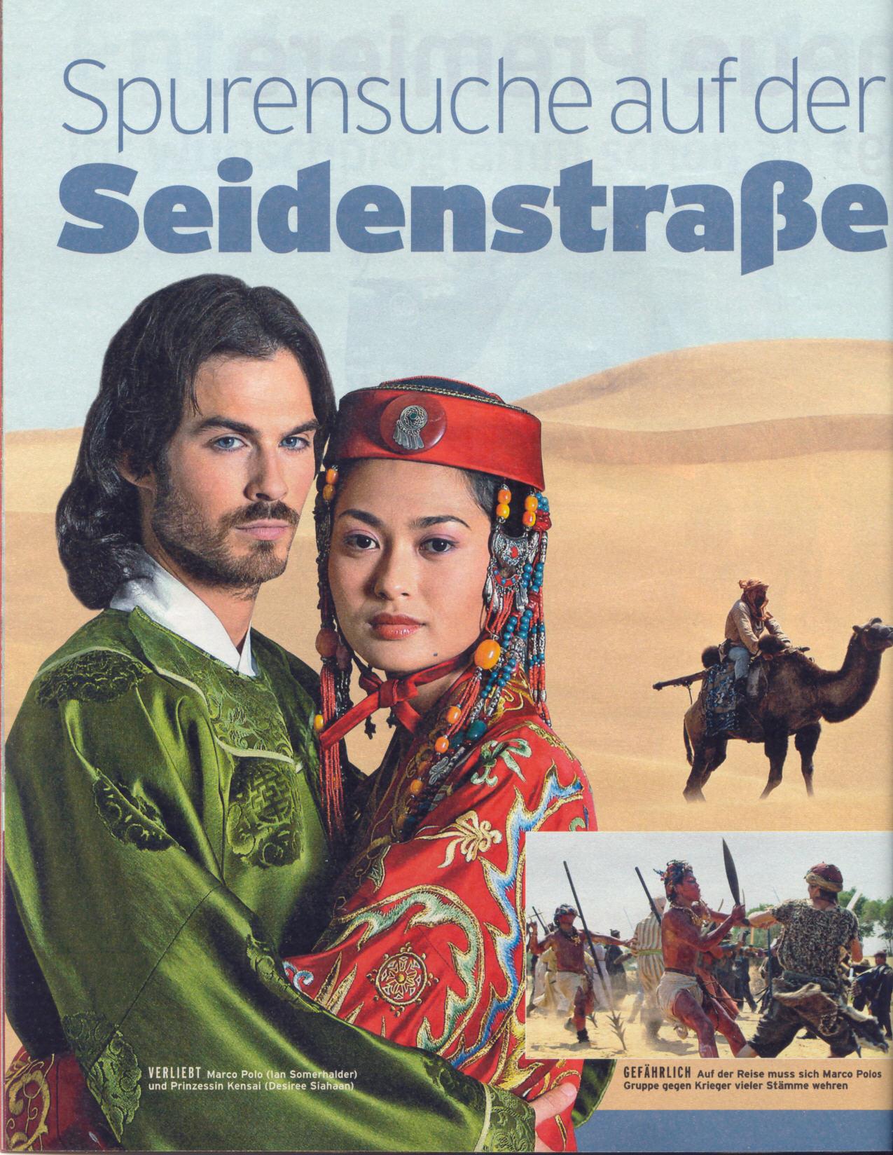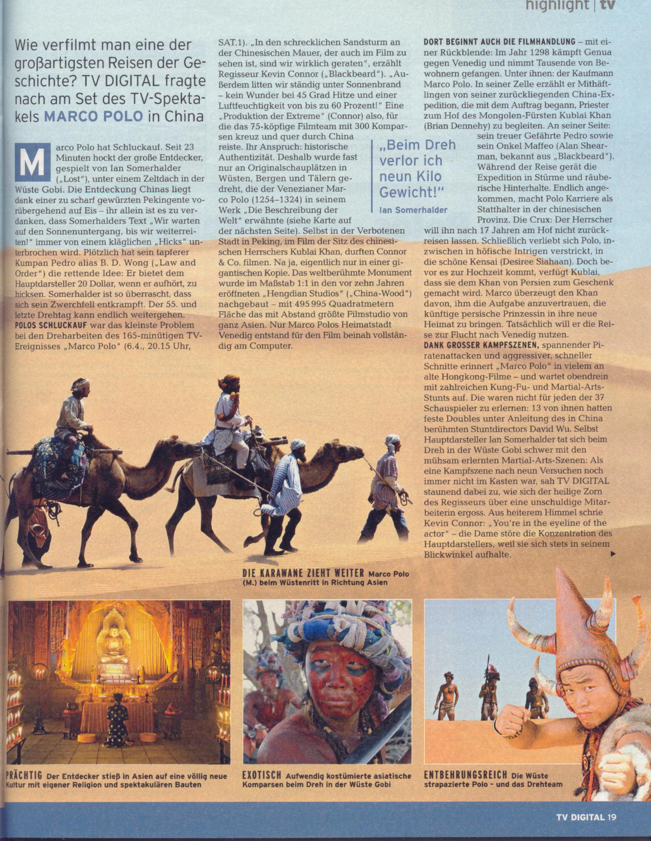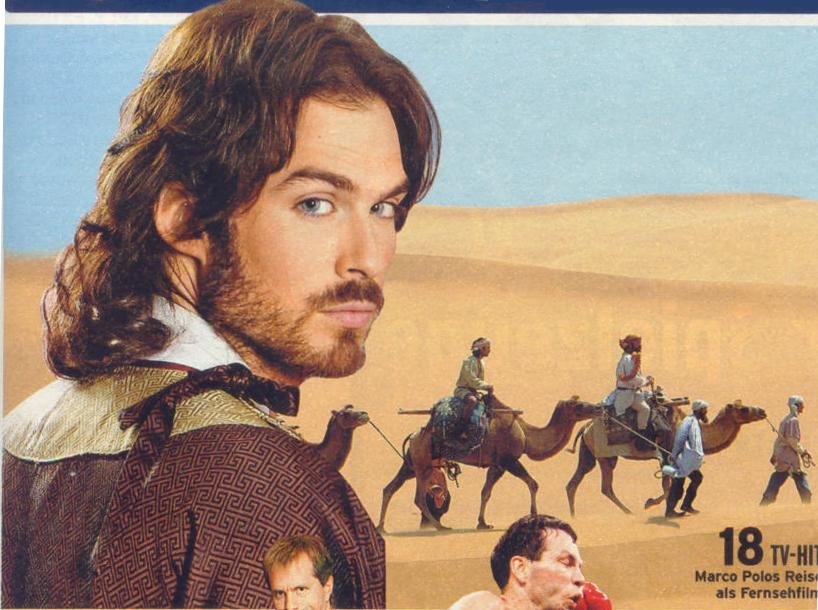 Как создать для кино самое великое путешествие всех времен? Журнал «TV Digital» решил провести расследование на съемочной площадке телефильма «Марко Поло» в Китае.Вот уже 23 минуты великий путешественник, которого играет Ян Сомерхолдера («Остаться в живых»), сидит в тени тента в пустыне Гоби и икает. Открытие Китая откладывается, благодаря слишком острой утке по-пекински, которая является единственной причиной перерыва съемок, не смотря на фразу Сомерхолдера: «Мы ждем заката, чтобы начать съемки», которая прерывается жалобным «ИК». Внезапно его храброму компаньону Педро, которого играет Би-Ди Вонг («Закон и порядок») приходит в голову замечательная идея: он предлагает актеру 20 долларов, если тот прекратит икать. Сомерхолдер так удивлен, что его диафрагма расслабляется. 55-ый и последний день съемок может продолжаться.