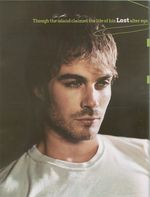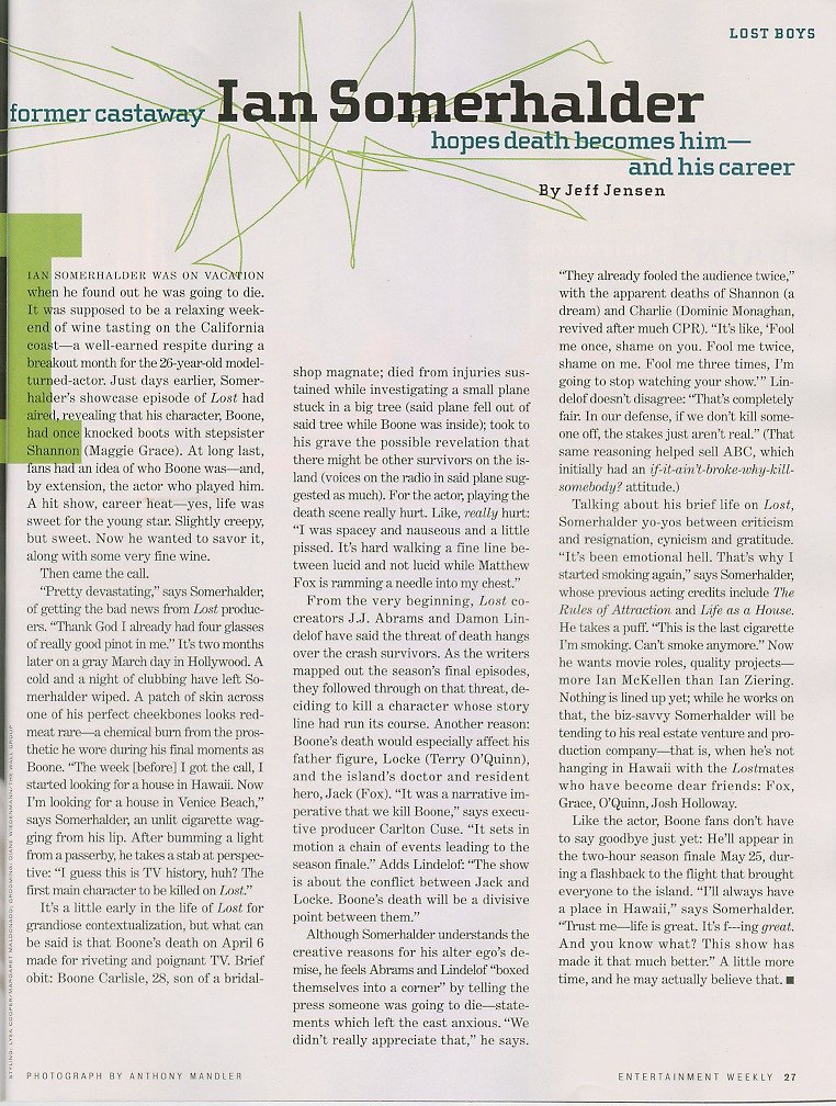"Милое опустошение, - говорит Сомерхолдер, насчет получения плохих новостей от продюсеров "Остаться в живых". - Слава Богу, что уже влил в себя четыре бокала вина". Спустя два месяца, серый мартовский день в Голливуде. После холода и ночи проведенной в клубах, Сомерхолдер заторчал. Кожа на одной из его прекрасных скул выглядит покрасневшей от химического ожога, связанного с протезом, который он носил в последние моменты, когда был Буном. "Неделей ранее, когда я присматривал себе дом на Гавайях, мне позвонили. Теперь я подыскиваю дом на венецианском берегу", - говорит Сомерхолдер, пожевывая незажженную сигарету губами. Получив огонек от прохожего, он начинает рассматривать перспективы: "Думаю, это ТВ-история, ха? Первый главный герой был убит в LOST".